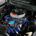 The black vinyl interior exudes an air of timeless elegance, with bucket seats offering both comfort and style. The chrome accents throughout the cabin, from the dash to the door handles, gleam with sophistication, reflecting the car’s rich heritage.  The original AM radio adds to the classic feel, while the iconic Mustang steering wheel provides a comfortable grip and a direct connection to the road.
